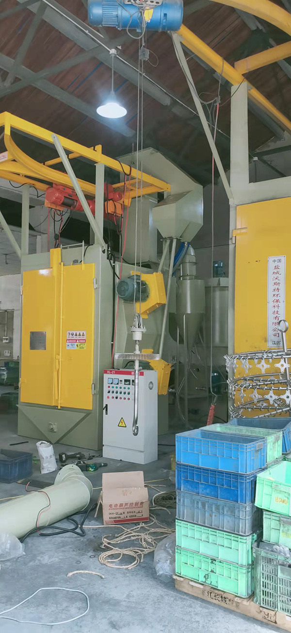 1.特點本機采用雙吊鉤吊掛形式,一外一內。在清理室內吊鉤吊掛工件接受拋丸清理時,外部吊鉤可人工卸下清理好的工件并掛上待清理的工件,當清理室內工件被清理完畢后,清理室內吊鉤沿軌道走到一邊,而外部已裝好工件的吊鉤便沿軌道進入清理室,這樣便優化了
